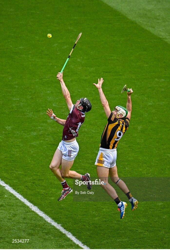 11 June 2023; Kevin Cooney of Galway in action against Paddy Deegan of Kilkenny during the Leinster GAA Hurling Senior Championship Final match between Kilkenny and Galway at Croke Park in Dublin. Photo by Seb Daly/Sportsfile