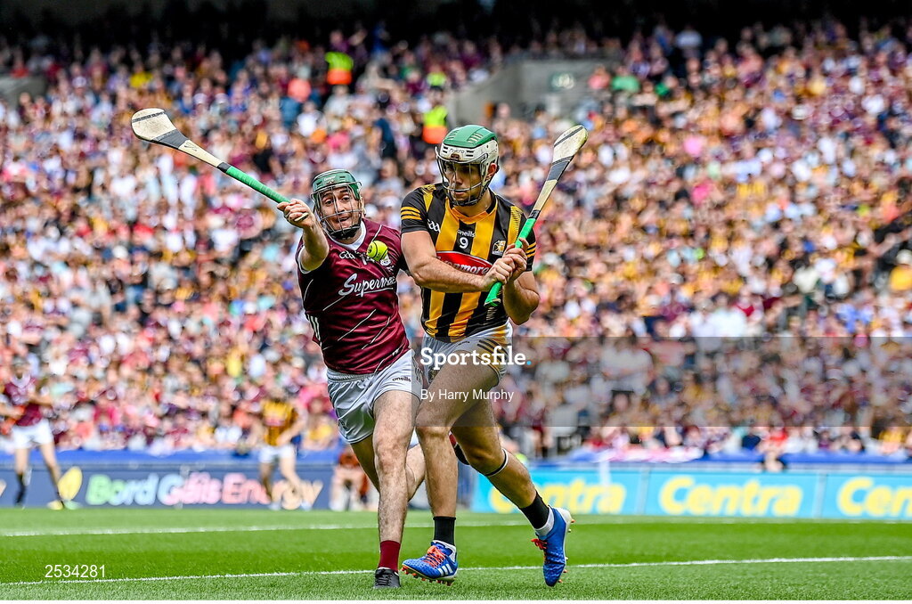 11 June 2023; Paddy Deegan of Kilkenny in action against Brian Concannon of Galway during the Leinster GAA Hurling Senior Championship Final match between Kilkenny and Galway at Croke Park in Dublin. Photo by Harry Murphy/Sportsfile