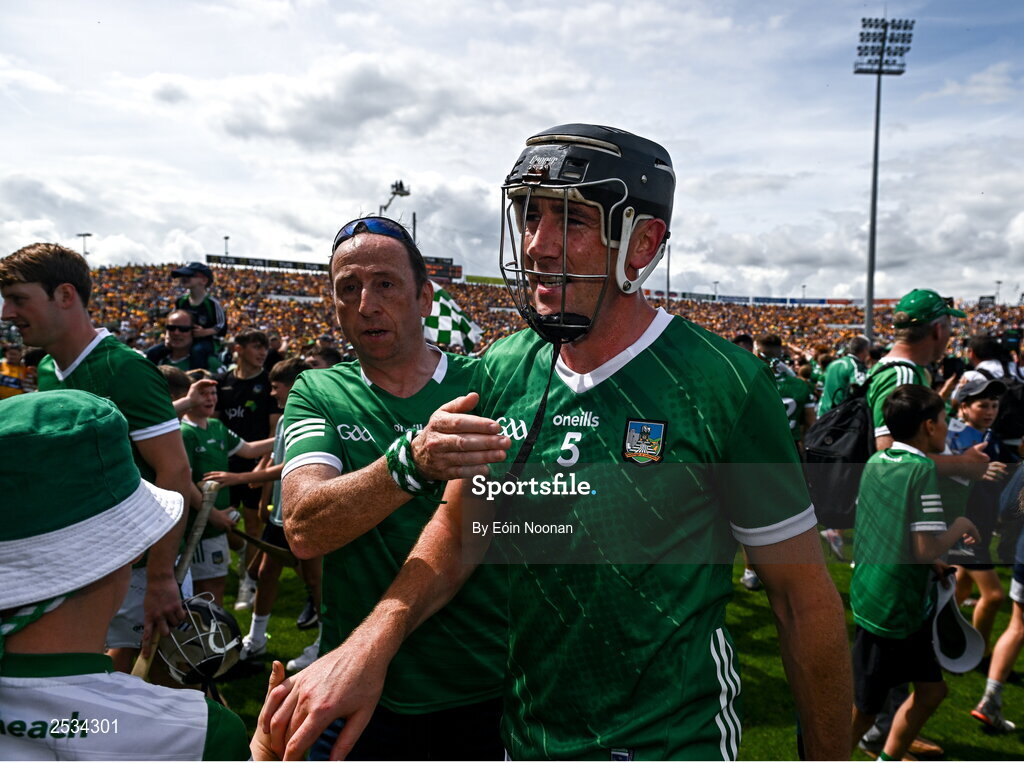 11 June 2023; Diarmaid Byrnes of Limerick celebrates with supporters after the Munster GAA Hurling Championship Final match between Clare and Limerick at TUS Gaelic Grounds in Limerick. Photo by Eóin Noonan/Sportsfile