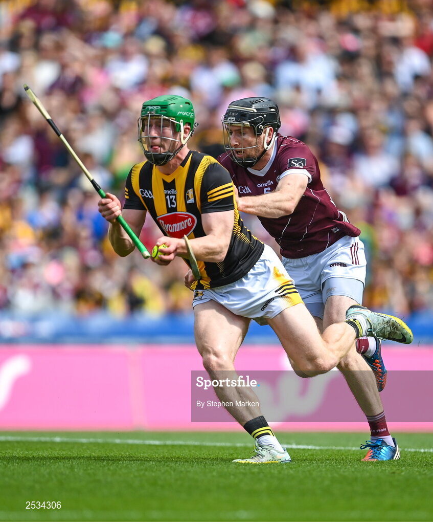 11 June 2023; Martin Keoghan of Kilkenny in action against Gearóid McInerney of Galway during the Leinster GAA Hurling Senior Championship Final match between Kilkenny and Galway at Croke Park in Dublin. Photo by Stephen Marken/Sportsfile