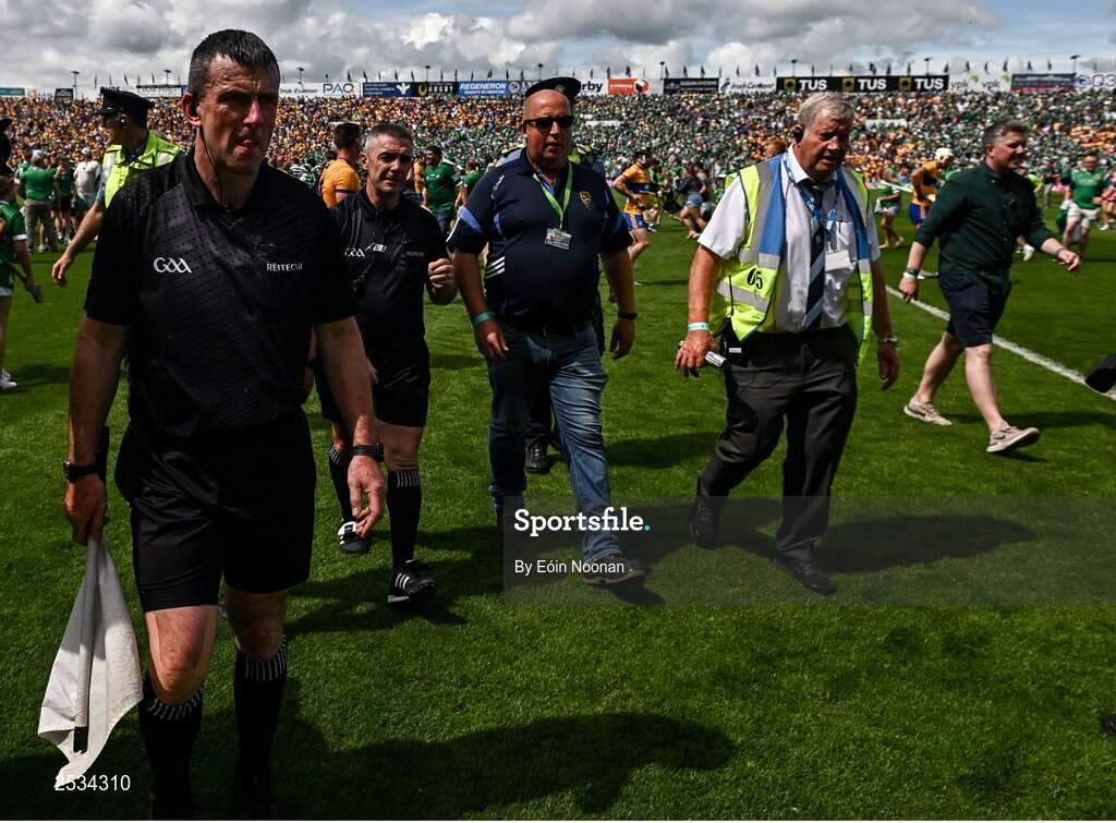 11 June 2023; Referee Liam Gordon is escorted from the pitch during the Munster GAA Hurling Championship Final match between Clare and Limerick at TUS Gaelic Grounds in Limerick. Photo by Eóin Noonan/Sportsfile