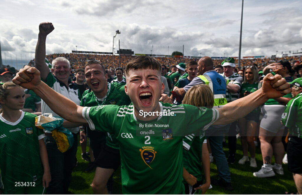 11 June 2023; Limerick supporters celebrate after the Munster GAA Hurling Championship Final match between Clare and Limerick at TUS Gaelic Grounds in Limerick. Photo by Eóin Noonan/Sportsfile