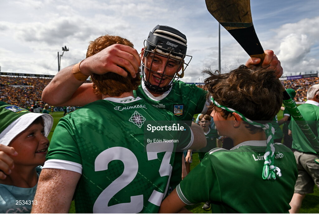 11 June 2023; Gearoid Hegarty of Limerick celebrates with teammate Cian Lynch after the Munster GAA Hurling Championship Final match between Clare and Limerick at TUS Gaelic Grounds in Limerick. Photo by Eóin Noonan/Sportsfile