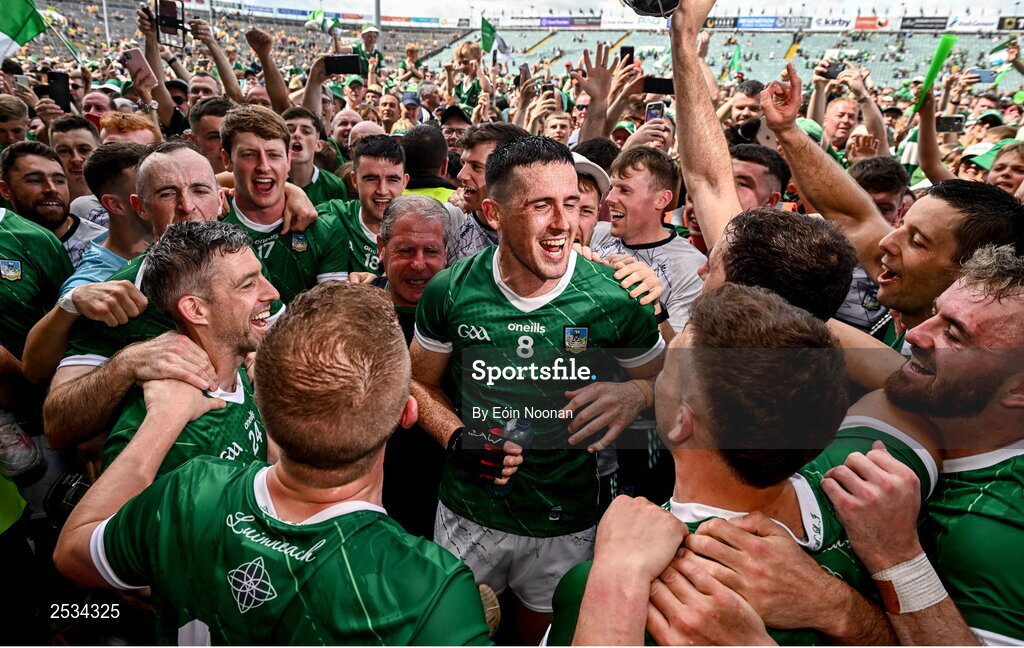 11 June 2023; Limerick players celebrate after the Munster GAA Hurling Championship Final match between Clare and Limerick at TUS Gaelic Grounds in Limerick. Photo by Eóin Noonan/Sportsfile