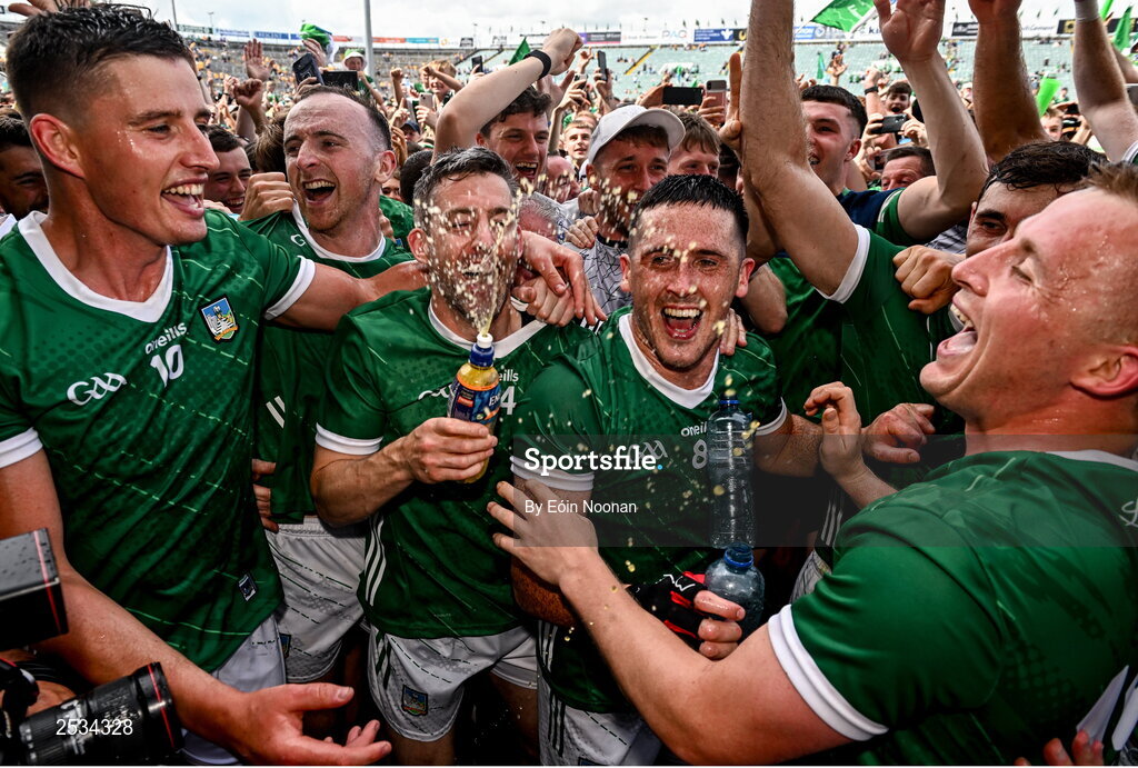 11 June 2023; Limerick players celebrate after the Munster GAA Hurling Championship Final match between Clare and Limerick at TUS Gaelic Grounds in Limerick. Photo by Eóin Noonan/Sportsfile