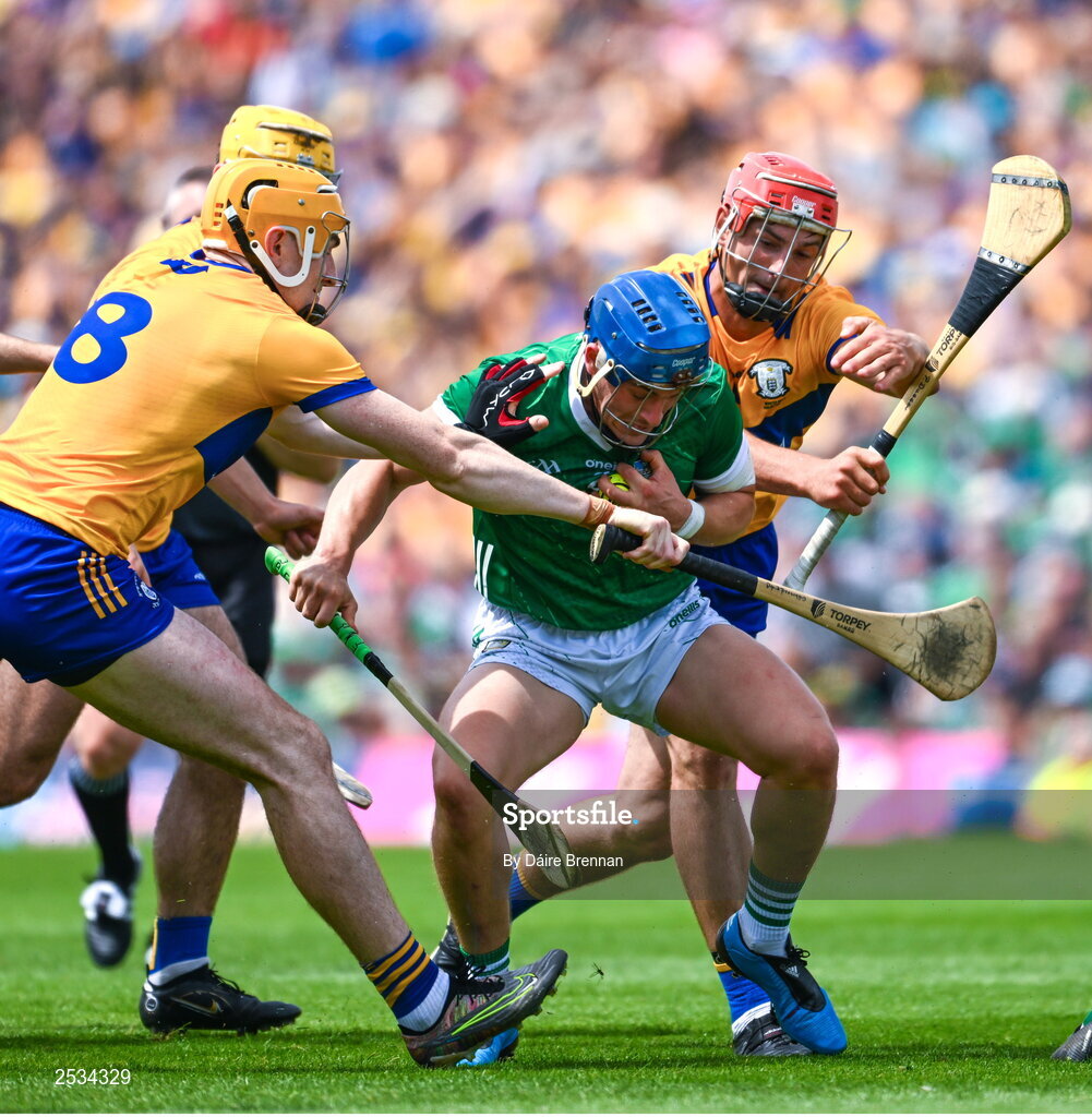 11 June 2023; Michael Casey of Limerick in action against David Fitzgerald, left, and Peter Duggan of Clare during the Munster GAA Hurling Championship Final match between Clare and Limerick at TUS Gaelic Grounds in Limerick. Photo by Daire Brennan/Sportsfile