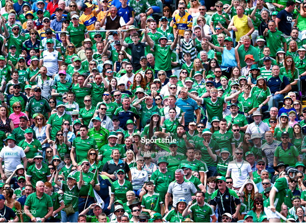 11 June 2023; Limerick supporters react to a decision during the Munster GAA Hurling Championship Final match between Clare and Limerick at TUS Gaelic Grounds in Limerick. Photo by Daire Brennan/Sportsfile