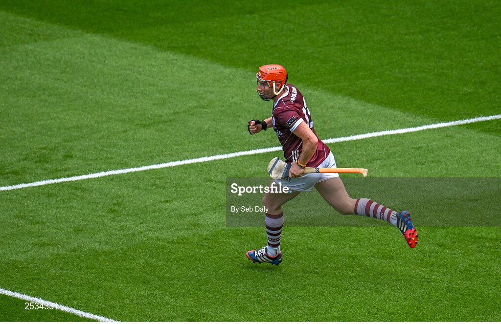 11 June 2023; Conor Whelan of Galway celebrates after scoring his side's first goal during the Leinster GAA Hurling Senior Championship Final match between Kilkenny and Galway at Croke Park in Dublin. Photo by Seb Daly/Sportsfile
