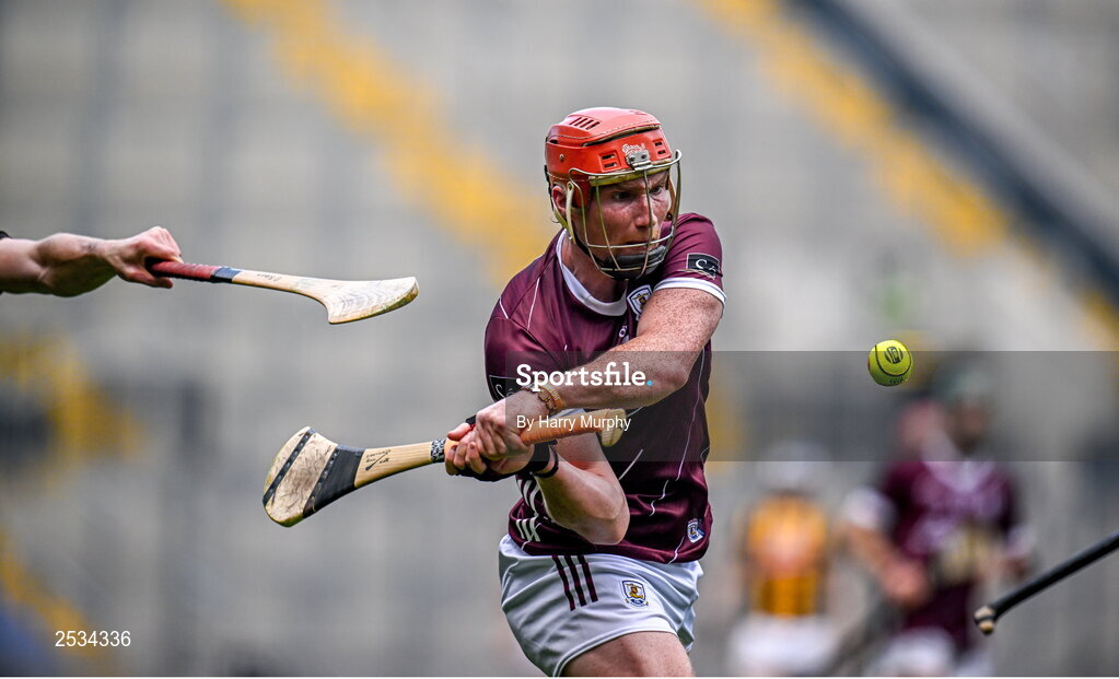 11 June 2023; Conor Whelan of Galway scores a point during the Leinster GAA Hurling Senior Championship Final match between Kilkenny and Galway at Croke Park in Dublin. Photo by Harry Murphy/Sportsfile