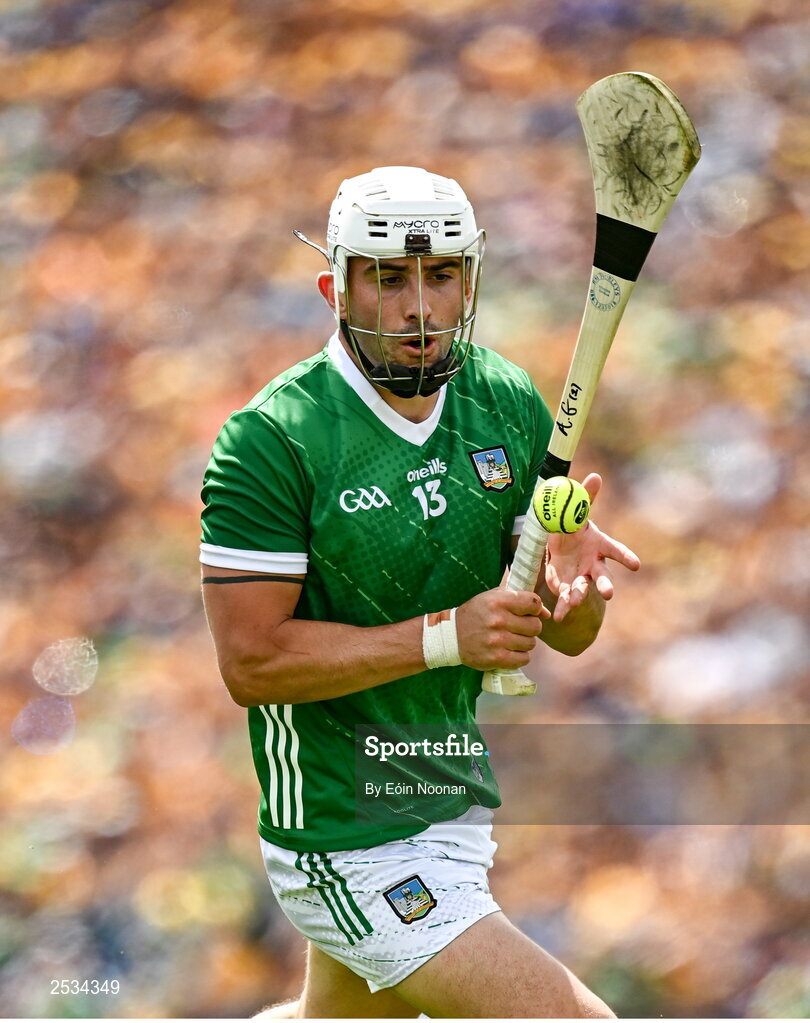 11 June 2023; Aaron Gillane of Limerick scores a point during the Munster GAA Hurling Championship Final match between Clare and Limerick at TUS Gaelic Grounds in Limerick. Photo by Eóin Noonan/Sportsfile
