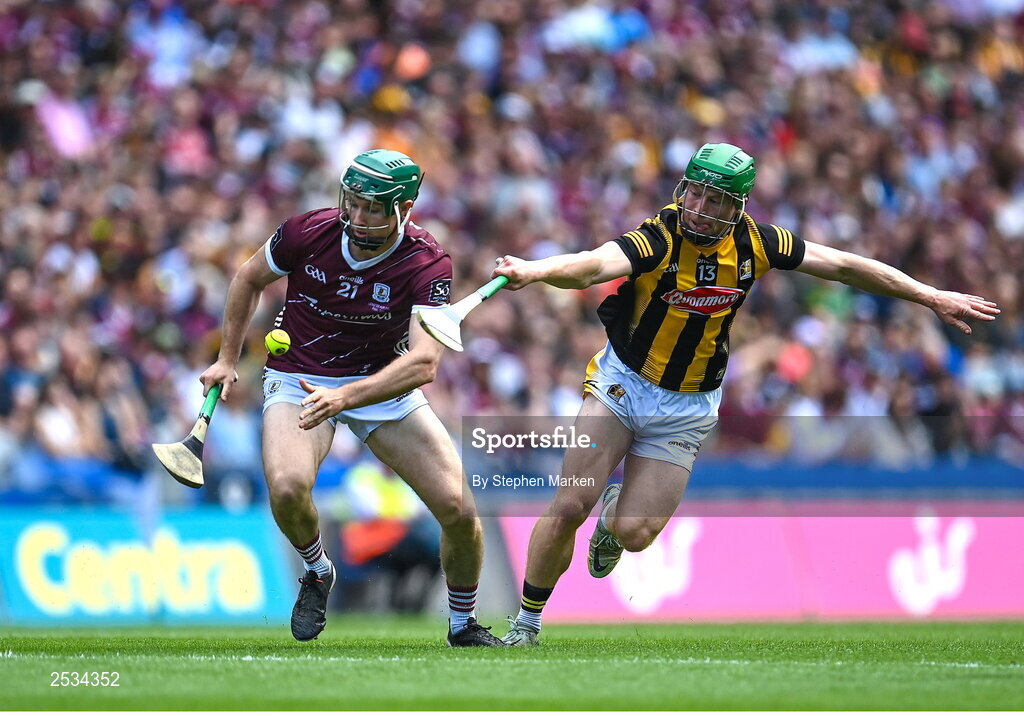 11 June 2023; Cathal Mannion of Galway in action against Martin Keoghan of Kilkenny during the Leinster GAA Hurling Senior Championship Final match between Kilkenny and Galway at Croke Park in Dublin. Photo by Stephen Marken/Sportsfile