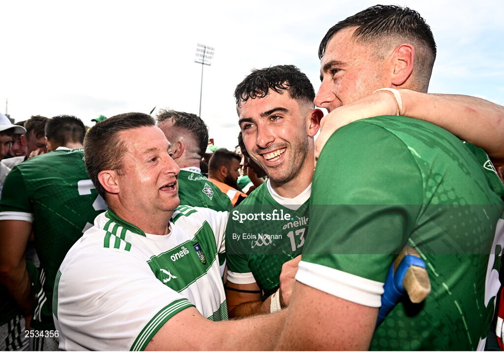 11 June 2023; Aaron Gillane of Limerick, centre, celebrates with teammate Diarmaid Byrnes and a supporter after the Munster GAA Hurling Championship Final match between Clare and Limerick at TUS Gaelic Grounds in Limerick. Photo by Eóin Noonan/Sportsfile