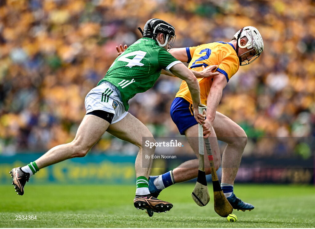 11 June 2023; Adam Hogan of Clare in action against Graeme Mulcahy of Limerick during the Munster GAA Hurling Championship Final match between Clare and Limerick at TUS Gaelic Grounds in Limerick. Photo by Eóin Noonan/Sportsfile