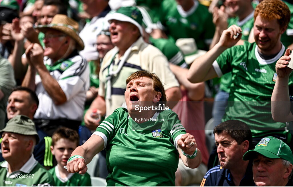 11 June 2023; A Limerick supporter celebrates a goal scored by Aaron Gillane of Limerick during the Munster GAA Hurling Championship Final match between Clare and Limerick at TUS Gaelic Grounds in Limerick. Photo by Eóin Noonan/Sportsfile