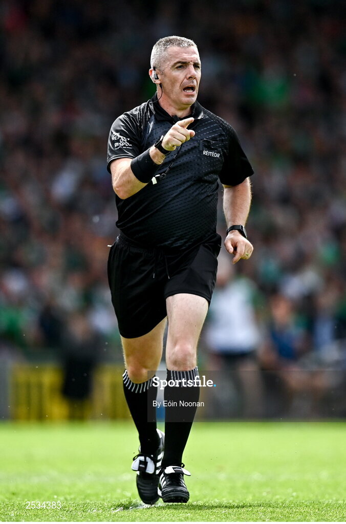 11 June 2023; Referee Liam Gordon during the Munster GAA Hurling Championship Final match between Clare and Limerick at TUS Gaelic Grounds in Limerick. Photo by Eóin Noonan/Sportsfile