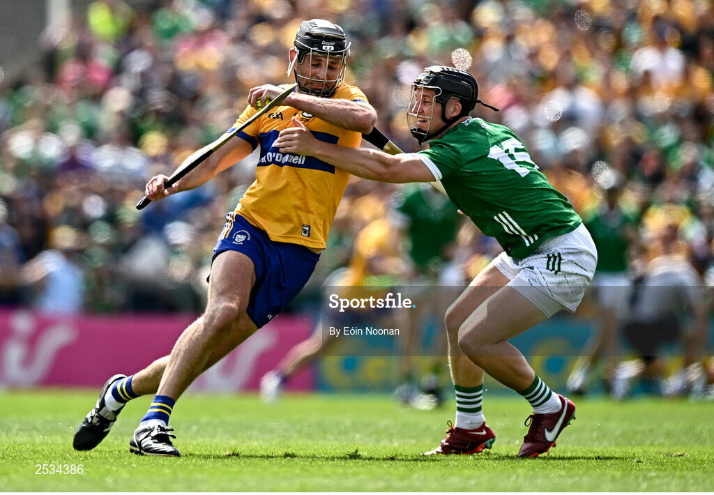 11 June 2023; Cathal Malone of Clare in action against Peter Casey of Limerick during the Munster GAA Hurling Championship Final match between Clare and Limerick at TUS Gaelic Grounds in Limerick. Photo by Eóin Noonan/Sportsfile