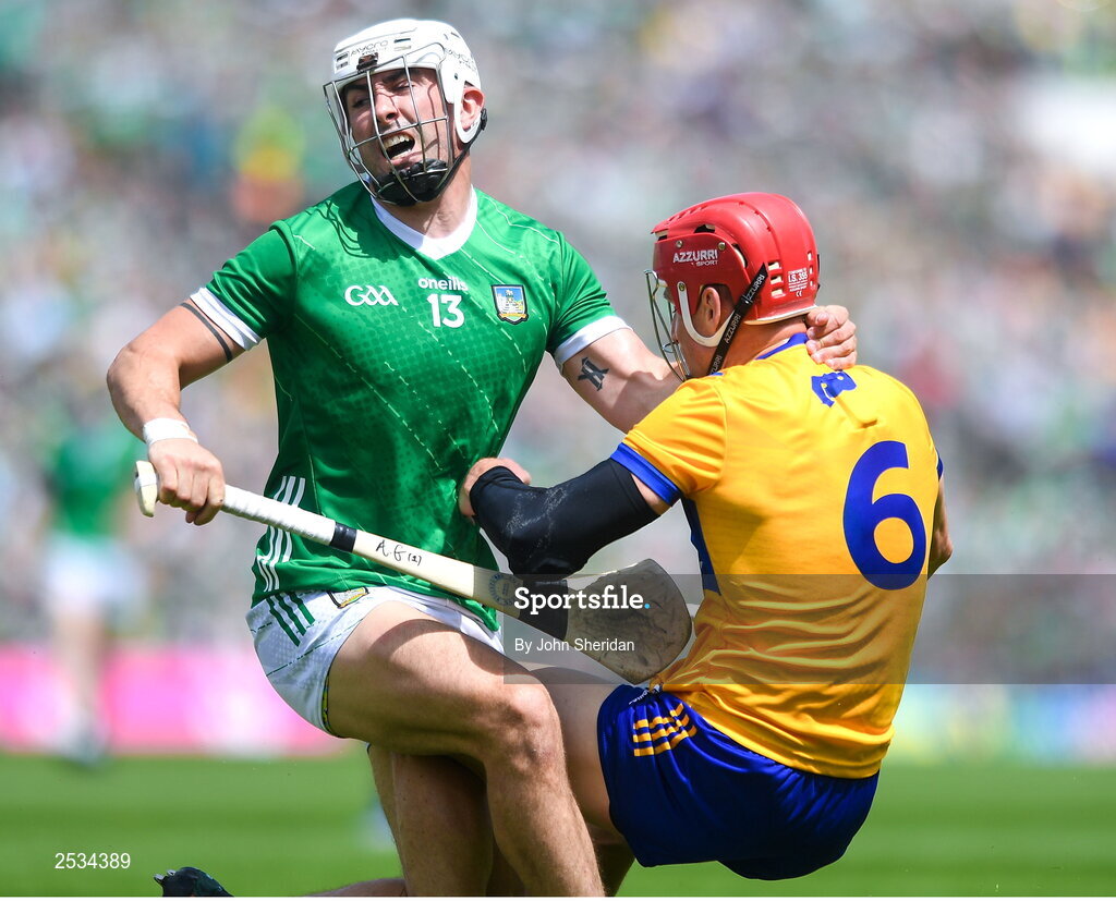 11 June 2023; John Conlon of Clare in action against Aaron Gillane of Limerick during the Munster GAA Hurling Championship Final match between Clare and Limerick at TUS Gaelic Grounds in Limerick. Photo by John Sheridan/Sportsfile