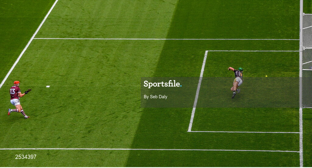 11 June 2023; Conor Whelan of Galway scores his side's first goal, past Kilkenny goalkeeper Eoin Murphy, during the Leinster GAA Hurling Senior Championship Final match between Kilkenny and Galway at Croke Park in Dublin. Photo by Seb Daly/Sportsfile
