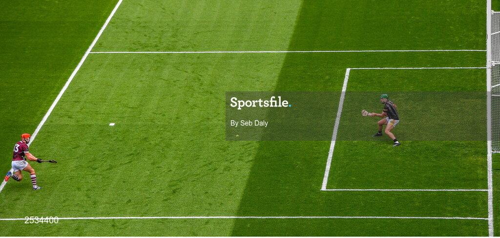11 June 2023; Conor Whelan of Galway scores his side's first goal, past Kilkenny goalkeeper Eoin Murphy, during the Leinster GAA Hurling Senior Championship Final match between Kilkenny and Galway at Croke Park in Dublin. Photo by Seb Daly/Sportsfile