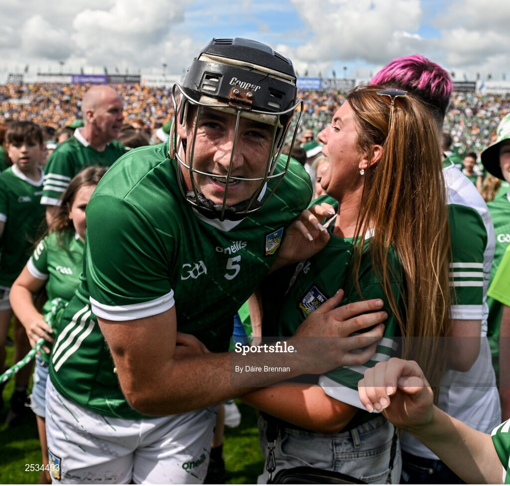 11 June 2023; Diarmaid Byrnes of Limerick celebrates with supporters after the Munster GAA Hurling Championship Final match between Clare and Limerick at TUS Gaelic Grounds in Limerick. Photo by Daire Brennan/Sportsfile