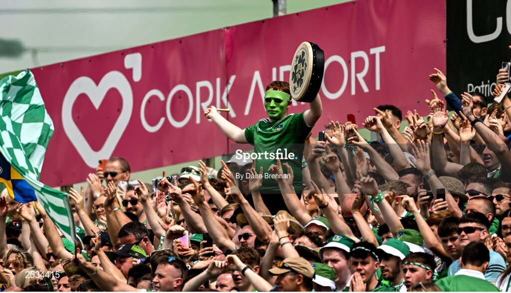 11 June 2023; A Limerick supporter on the City Terrace ahead of the Munster GAA Hurling Championship Final match between Clare and Limerick at TUS Gaelic Grounds in Limerick. Photo by Daire Brennan/Sportsfile