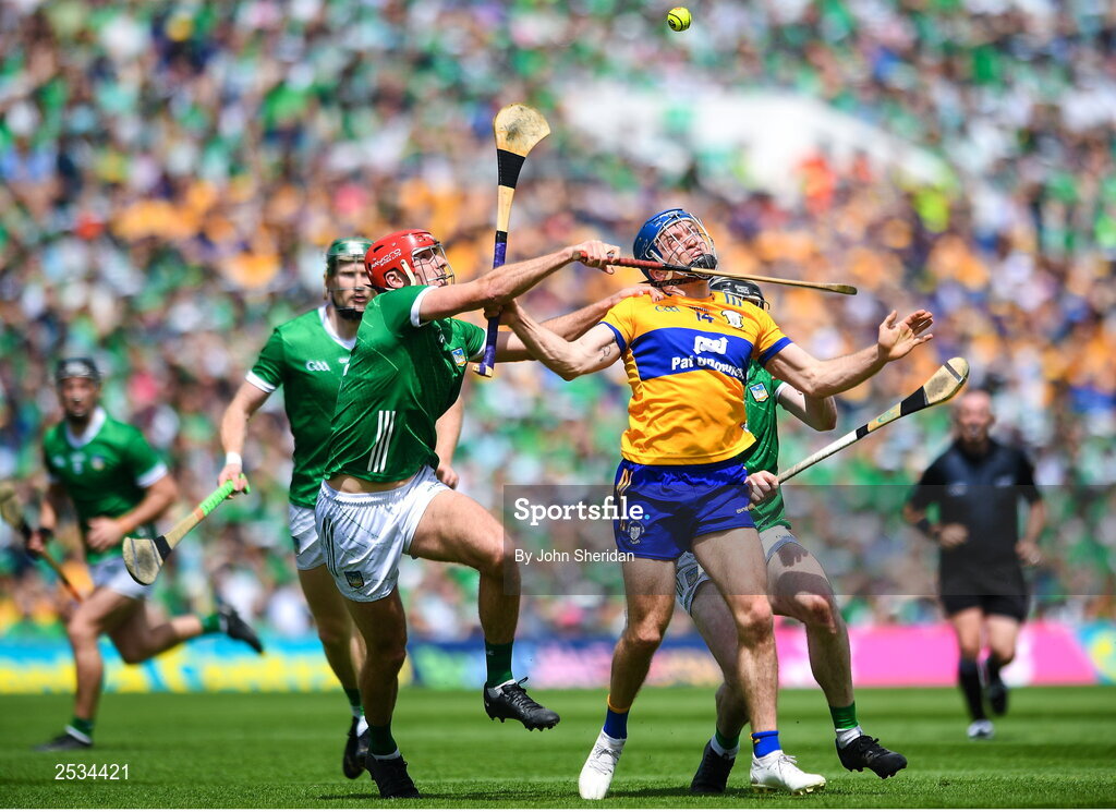 11 June 2023; Shane O'Donnell of Clare in action against Barry Nash of Limerick during the Munster GAA Hurling Championship Final match between Clare and Limerick at TUS Gaelic Grounds in Limerick. Photo by John Sheridan/Sportsfile