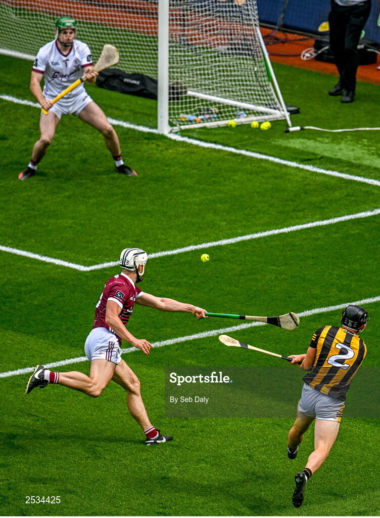 11 June 2023; Mikey Butler of Kilkenny, bottom right, scores his side's third goal during the Leinster GAA Hurling Senior Championship Final match between Kilkenny and Galway at Croke Park in Dublin. Photo by Seb Daly/Sportsfile