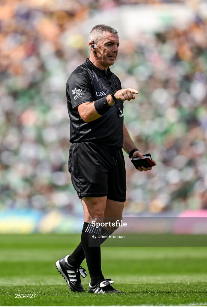11 June 2023; Referee Liam Gordon during the Munster GAA Hurling Championship Final match between Clare and Limerick at TUS Gaelic Grounds in Limerick. Photo by Daire Brennan/Sportsfile