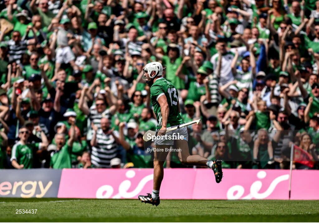 11 June 2023; Aaron Gillane of Limerick celebrates after scoring his side's first goal during the Munster GAA Hurling Championship Final match between Clare and Limerick at TUS Gaelic Grounds in Limerick. Photo by Daire Brennan/Sportsfile