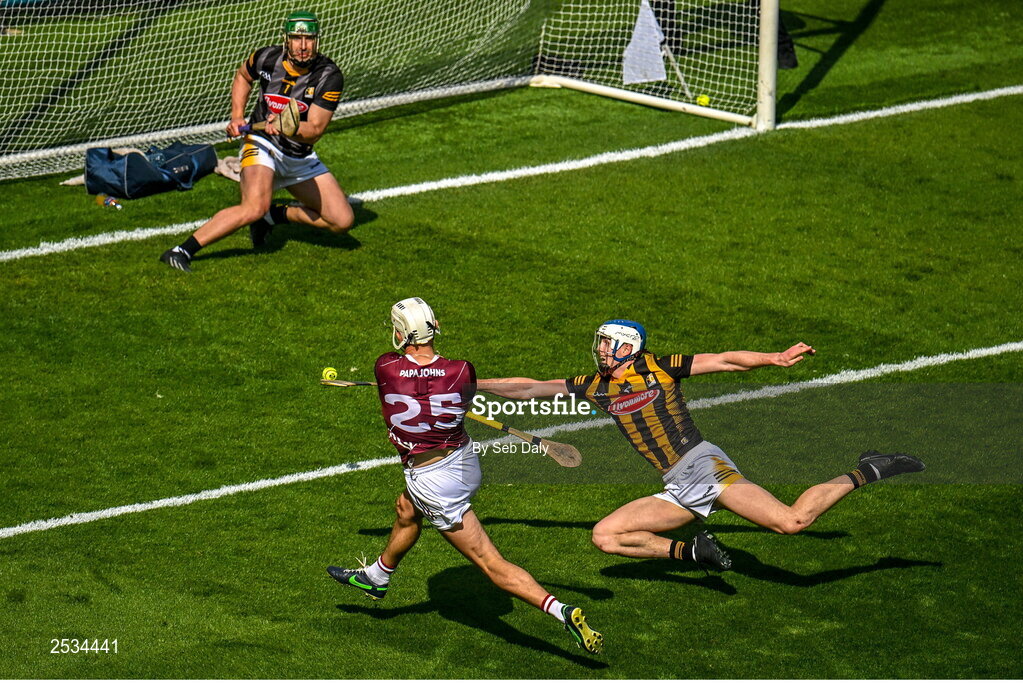 11 June 2023; Jason Flynn of Galway scores his side's second goal, despite pressure from Kilkenny's Huw Lawlor, during the Leinster GAA Hurling Senior Championship Final match between Kilkenny and Galway at Croke Park in Dublin. Photo by Seb Daly/Sportsfile