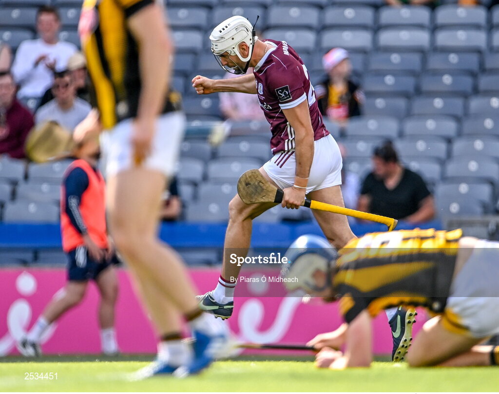 11 June 2023; Jason Flynn of Galway celebrates after scoring his side's second goal during the Leinster GAA Hurling Senior Championship Final match between Kilkenny and Galway at Croke Park in Dublin. Photo by Piaras Ó Mídheach/Sportsfile