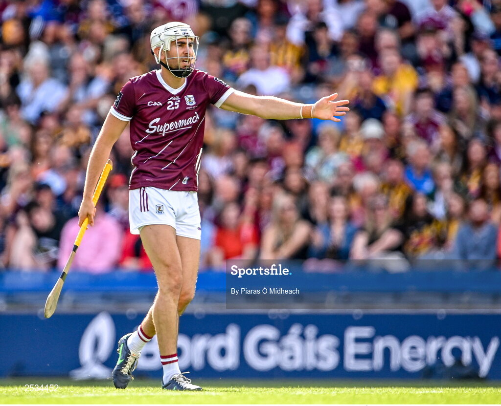 11 June 2023; Jason Flynn of Galway after scoring his side's second goal during the Leinster GAA Hurling Senior Championship Final match between Kilkenny and Galway at Croke Park in Dublin. Photo by Piaras Ó Mídheach/Sportsfile