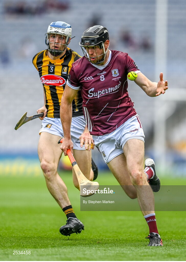 11 June 2023; Joseph Cooney of Galway in action against Huw Lawlor of Kilkenny during the Leinster GAA Hurling Senior Championship Final match between Kilkenny and Galway at Croke Park in Dublin. Photo by Stephen Marken/Sportsfile
