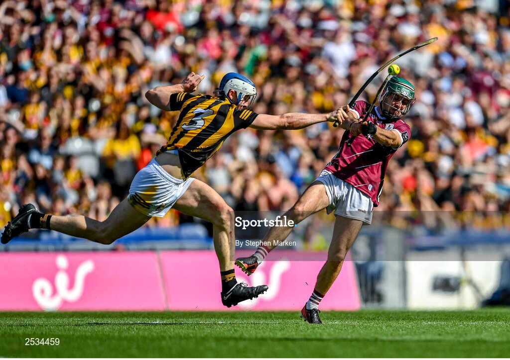 11 June 2023; Evan Niland of Galway in action against Huw Lawlor of Kilkenny during the Leinster GAA Hurling Senior Championship Final match between Kilkenny and Galway at Croke Park in Dublin. Photo by Stephen Marken/Sportsfile