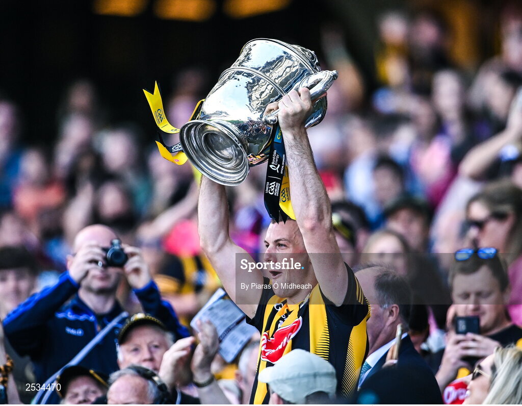 11 June 2023; Kilkenny captain Eoin Cody lifts the Bob O'Keeffe Cup after his side's victory in the Leinster GAA Hurling GAA Championship Final match between Kilkenny and Galway at Croke Park in Dublin. Photo by Piaras Ó Mídheach/Sportsfile