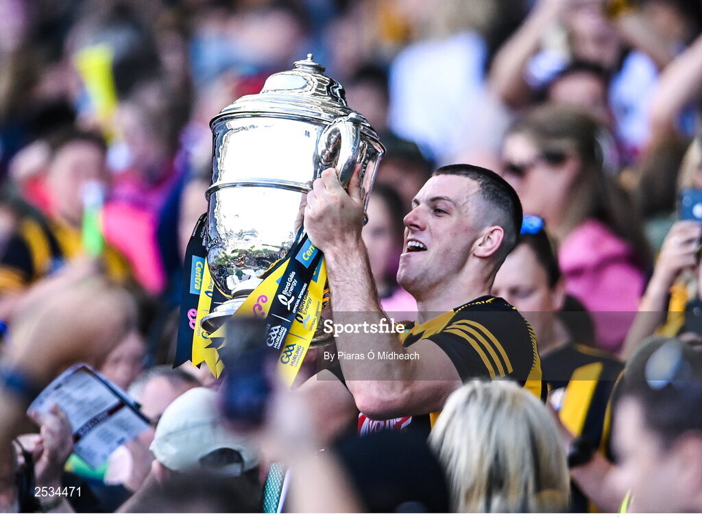 11 June 2023; Kilkenny captain Eoin Cody lifts the Bob O'Keeffe Cup after his side's victory in the Leinster GAA Hurling GAA Championship Final match between Kilkenny and Galway at Croke Park in Dublin. Photo by Piaras Ó Mídheach/Sportsfile