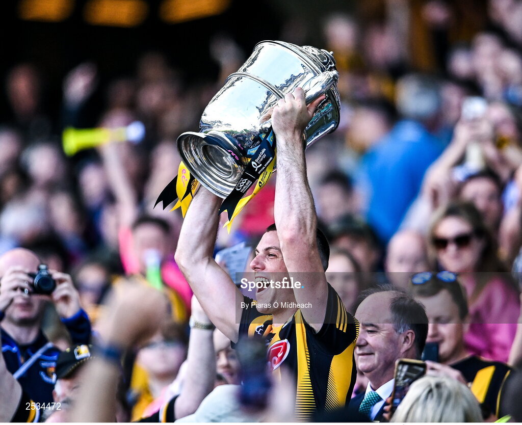 11 June 2023; Kilkenny captain Eoin Cody lifts the Bob O'Keeffe Cup after his side's victory in the Leinster GAA Hurling GAA Championship Final match between Kilkenny and Galway at Croke Park in Dublin. Photo by Piaras Ó Mídheach/Sportsfile