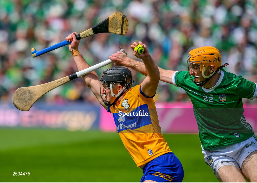 11 June 2023; Ian Galvin of Clare is tackled by Richie English of Limerick during the Munster GAA Hurling Championship Final match between Clare and Limerick at TUS Gaelic Grounds in Limerick. Photo by Ray McManus/Sportsfile