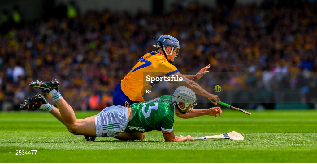 11 June 2023; Aaron Gillane of Limerick is tackled by Cian Nolan of Clare during the Munster GAA Hurling Championship Final match between Clare and Limerick at TUS Gaelic Grounds in Limerick. Photo by Ray McManus/Sportsfile