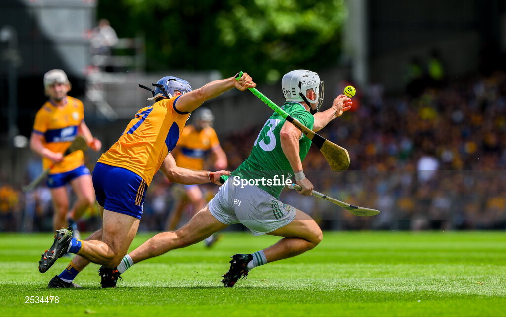 11 June 2023; Aaron Gillane of Limerick is tackled by Cian Nolan of Clare during the Munster GAA Hurling Championship Final match between Clare and Limerick at TUS Gaelic Grounds in Limerick. Photo by Ray McManus/Sportsfile