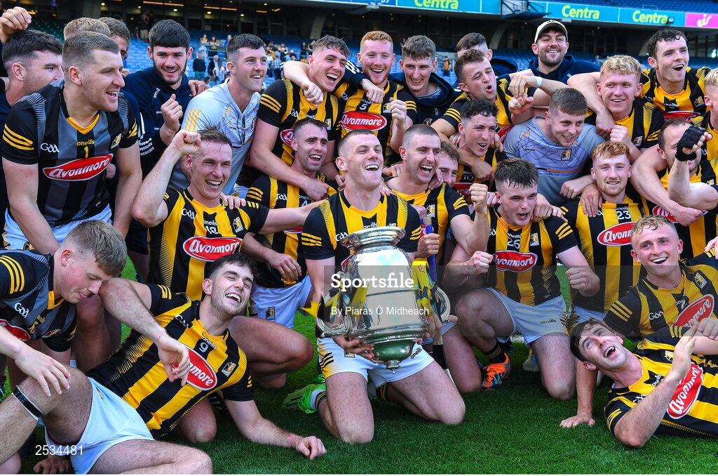 11 June 2023; Kilkenny captain Eoin Cody celebrates with the Bob O'Keeffe Cup after his side's victory in the Leinster GAA Hurling GAA Championship Final match between Kilkenny and Galway at Croke Park in Dublin. Photo by Piaras Ó Mídheach/Sportsfile