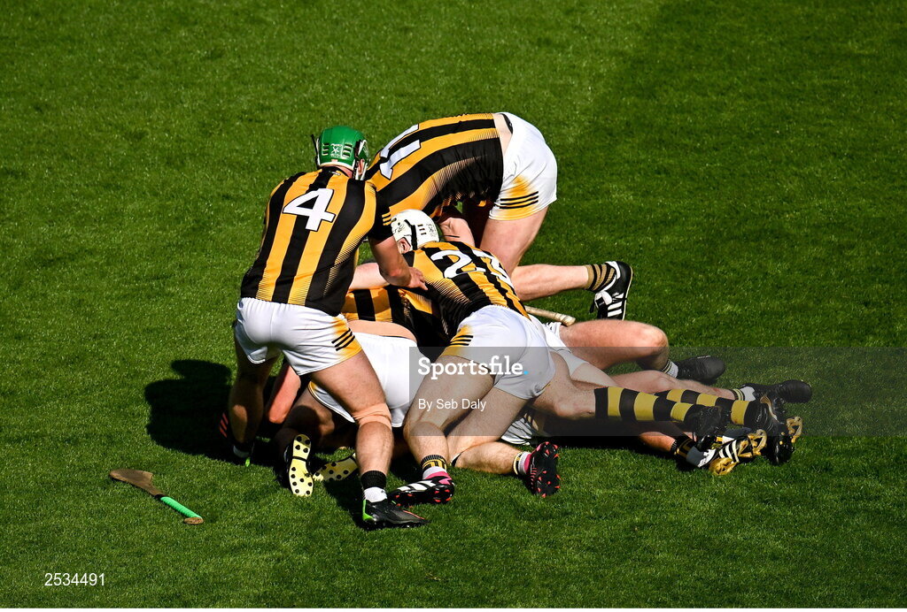 11 June 2023; Kilkenny players celebrate after their side's victory in the Leinster GAA Hurling Senior Championship Final match between Kilkenny and Galway at Croke Park in Dublin. Photo by Seb Daly/Sportsfile