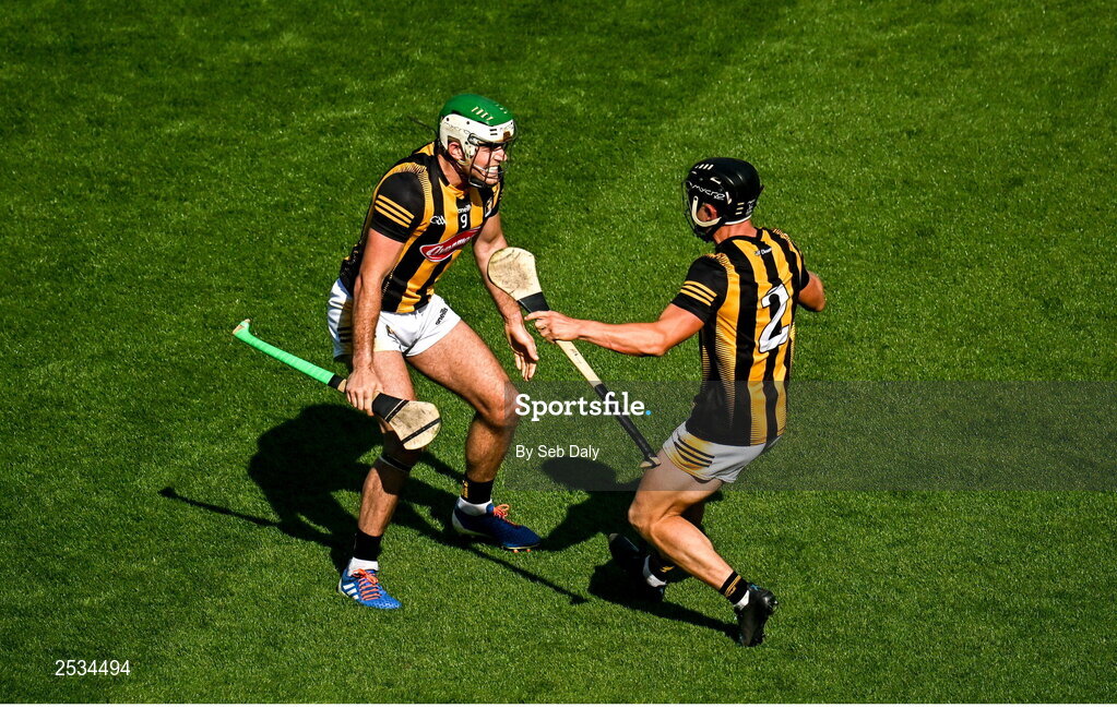 11 June 2023; Kilkenny players Paddy Deegan, left, and Mikey Butler celebrate after their side's victory in the Leinster GAA Hurling Senior Championship Final match between Kilkenny and Galway at Croke Park in Dublin. Photo by Seb Daly/Sportsfile