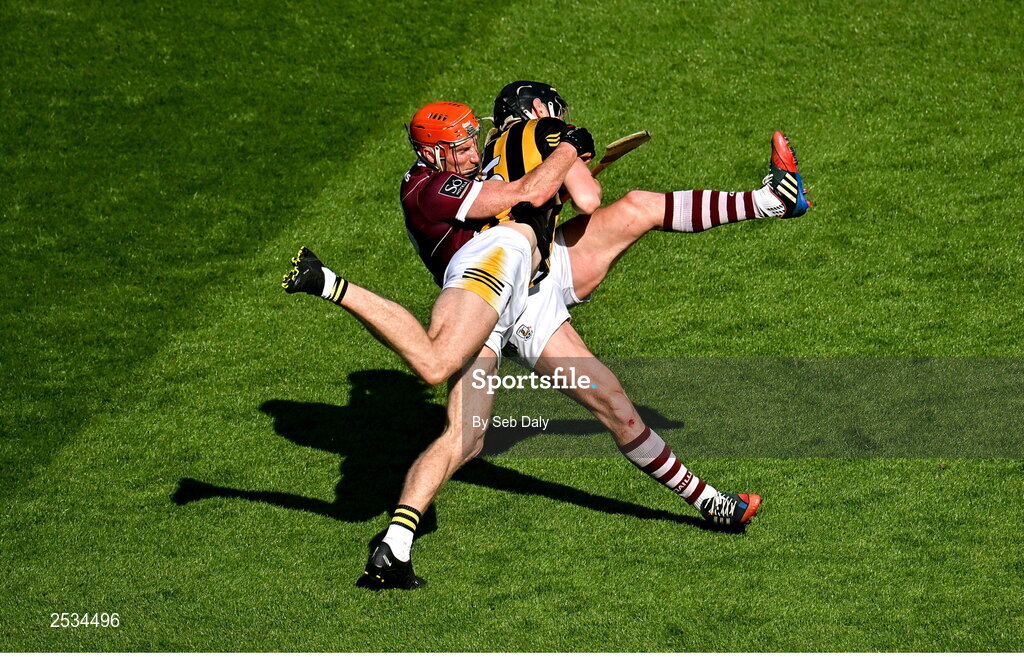 11 June 2023; David Blanchfield of Kilkenny is tackled by Conor Whelan of Galway during the Leinster GAA Hurling Senior Championship Final match between Kilkenny and Galway at Croke Park in Dublin. Photo by Seb Daly/Sportsfile