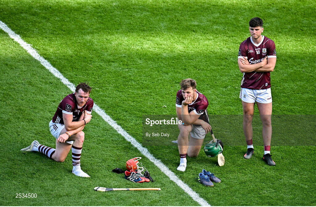 11 June 2023; Galway players, from left, Conor Whelan, Fintan Burke and Eoin Lawless after their side's defeat in the Leinster GAA Hurling Senior Championship Final match between Kilkenny and Galway at Croke Park in Dublin. Photo by Seb Daly/Sportsfile