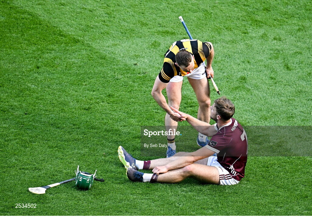 11 June 2023; Fintan Burke of Galway and Conor Fogarty of Kilkenny shake hands after the Leinster GAA Hurling Senior Championship Final match between Kilkenny and Galway at Croke Park in Dublin. Photo by Seb Daly/Sportsfile