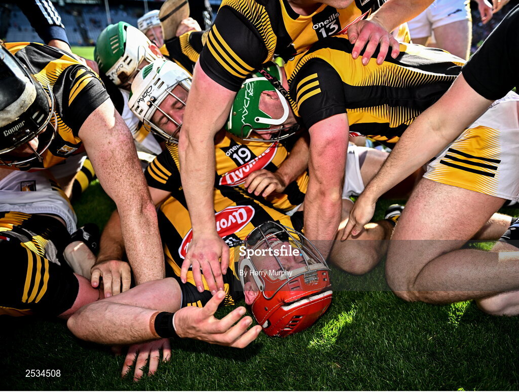 11 June 2023; Cillian Buckley of Kilkenny, red helmet, celebrates with teammates after their side's victory in the Leinster GAA Hurling Senior Championship Final match between Kilkenny and Galway at Croke Park in Dublin. Photo by Harry Murphy/Sportsfile