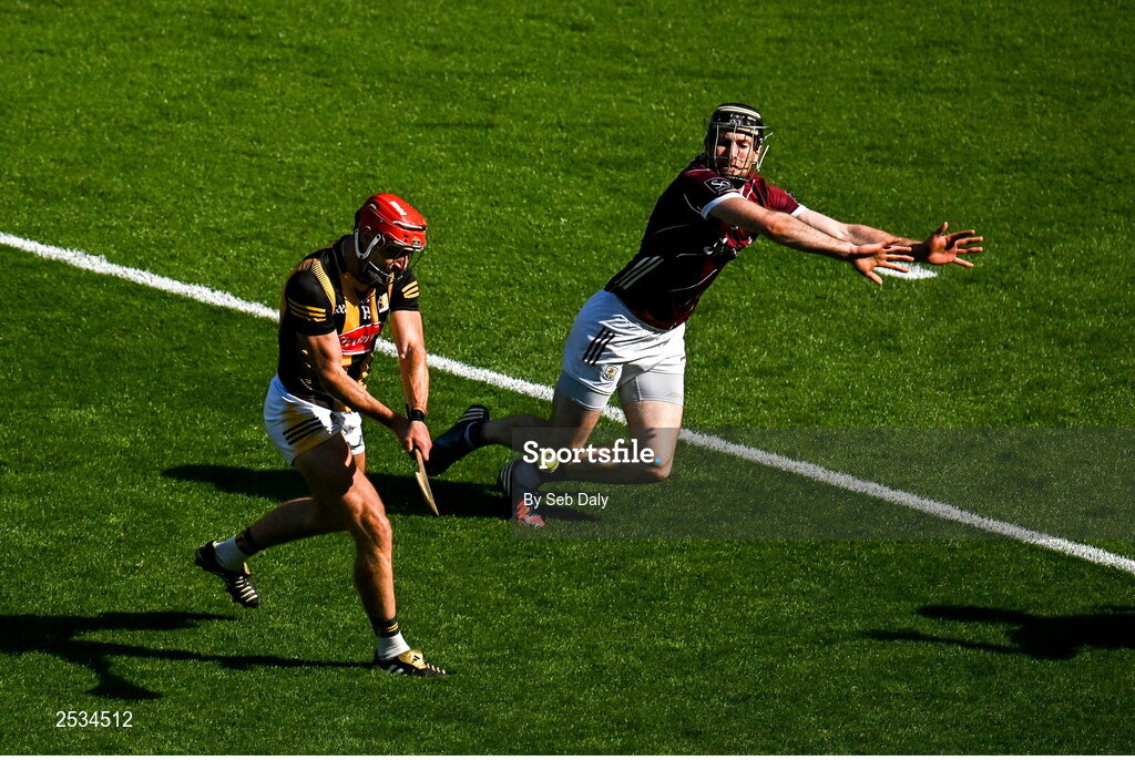 11 June 2023; Cillian Buckley of Kilkenny scores his side's fourth and winning goal, despite the efforts of Galway's Pádraic Mannion, during the Leinster GAA Hurling Senior Championship Final match between Kilkenny and Galway at Croke Park in Dublin. Photo by Seb Daly/Sportsfile