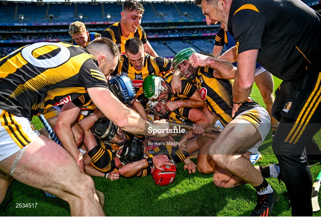 11 June 2023; Cillian Buckley of Kilkenny, red helmet, celebrates with teammates after their side's victory in the Leinster GAA Hurling Senior Championship Final match between Kilkenny and Galway at Croke Park in Dublin. Photo by Harry Murphy/Sportsfile