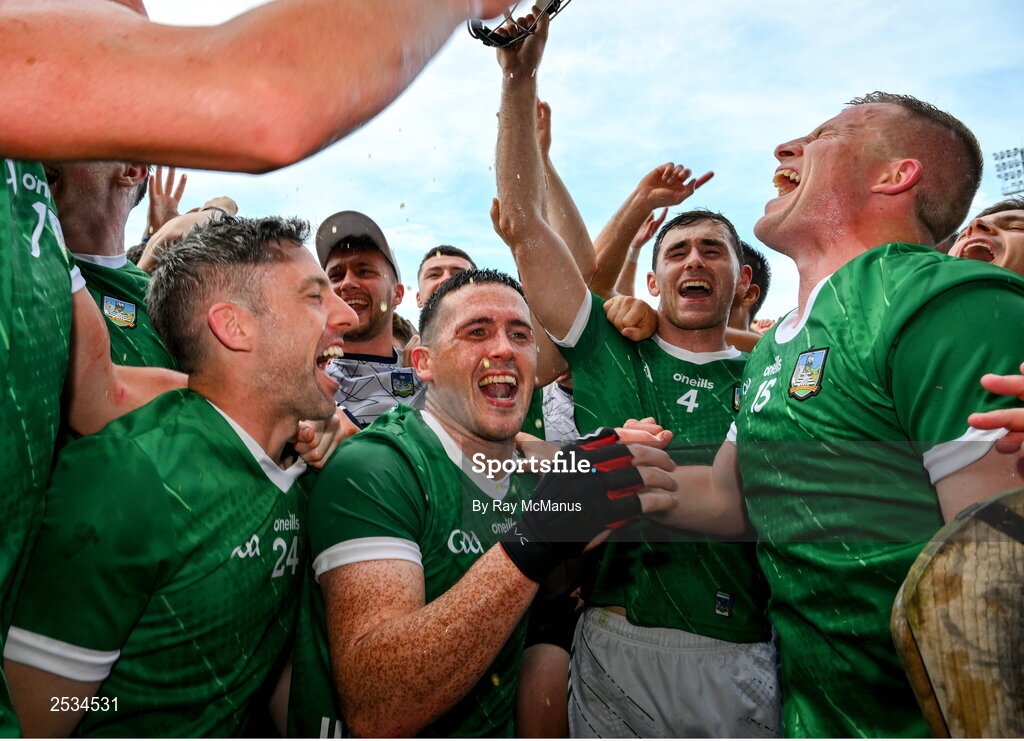 11 June 2023; Limerick players celebrate after the Munster GAA Hurling Championship Final match between Clare and Limerick at TUS Gaelic Grounds in Limerick. Photo by Ray McManus/Sportsfile